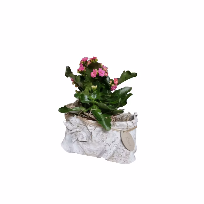 En handgjuten kruka med lekfull design i form av en väska, dekorerad med en vacker fjäril. Perfekt för blommor inomhus eller ute på altanen och i trädgården.