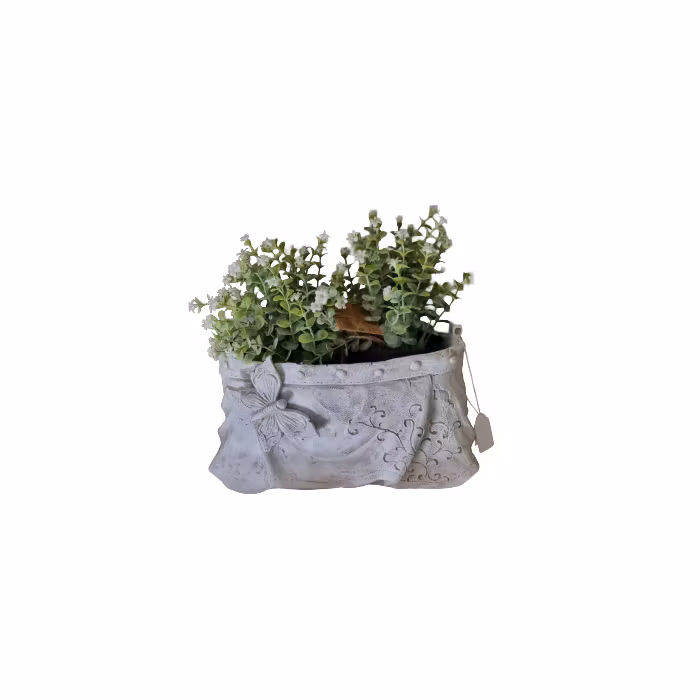 Kruka i betong – formad som väska med fjärilEn handgjuten kruka med lekfull design i form av en väska, dekorerad med en vacker fjäril. Perfekt för blommor inomh