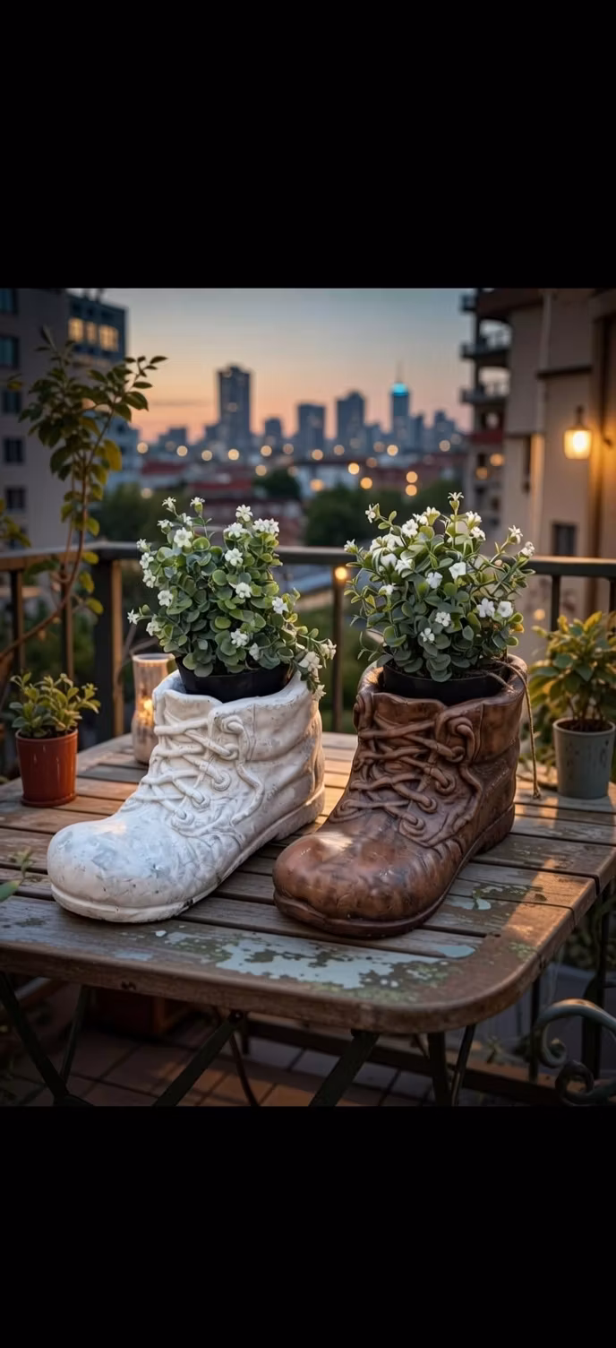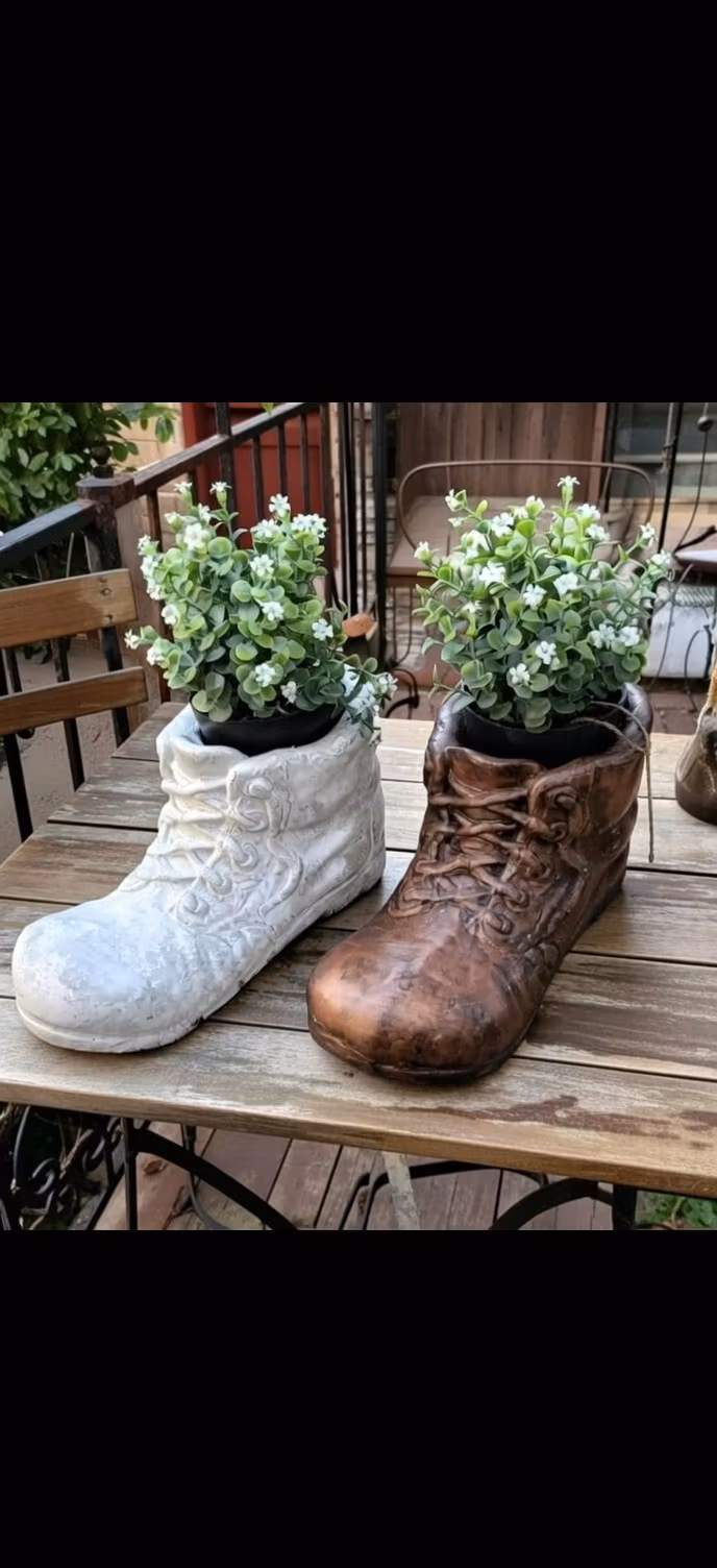 En lekfull och unik kruka formad som en stor känga, perfekt för växter och blomsterarrangemang.