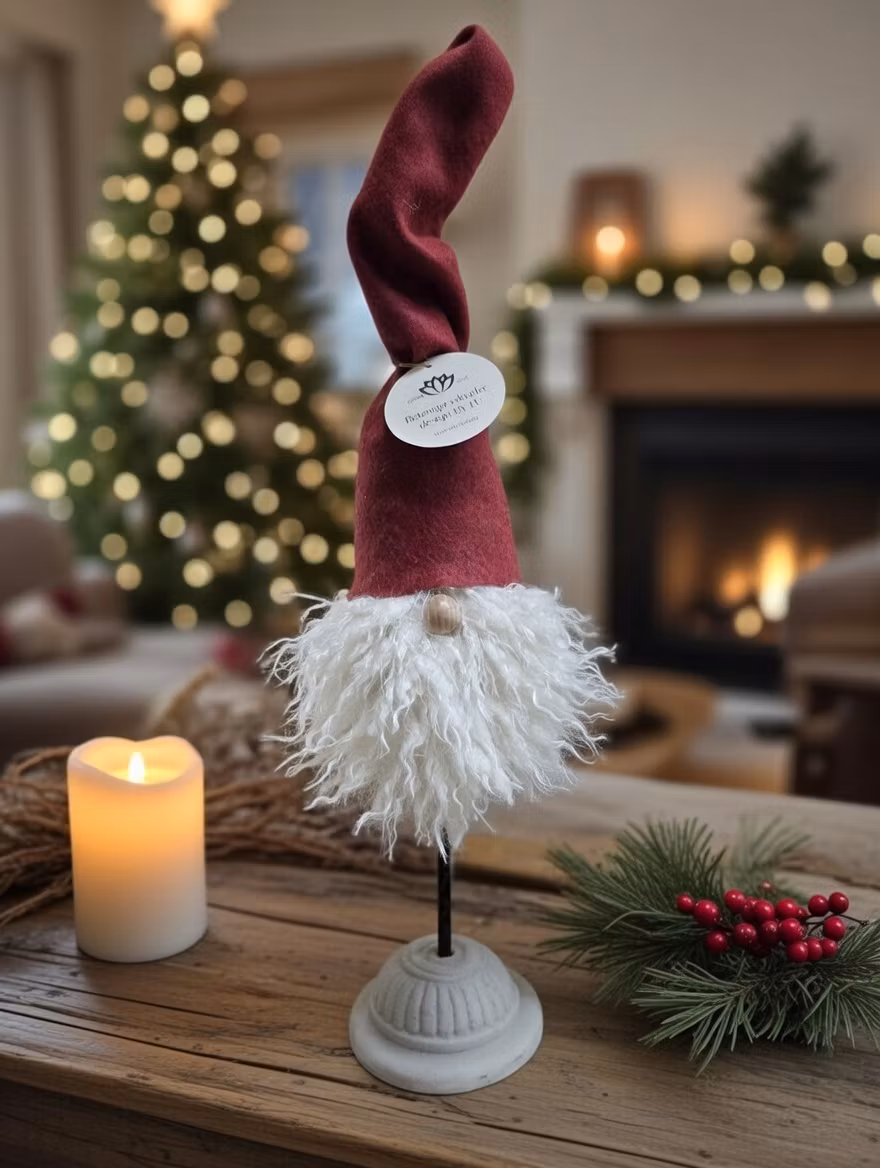 Handgjord tomte med formbar luva – armeringsjärn i betongfotenEn unik och charmig tomte som sprider både värme och karaktär i ditt hem. Varje tomte är hand