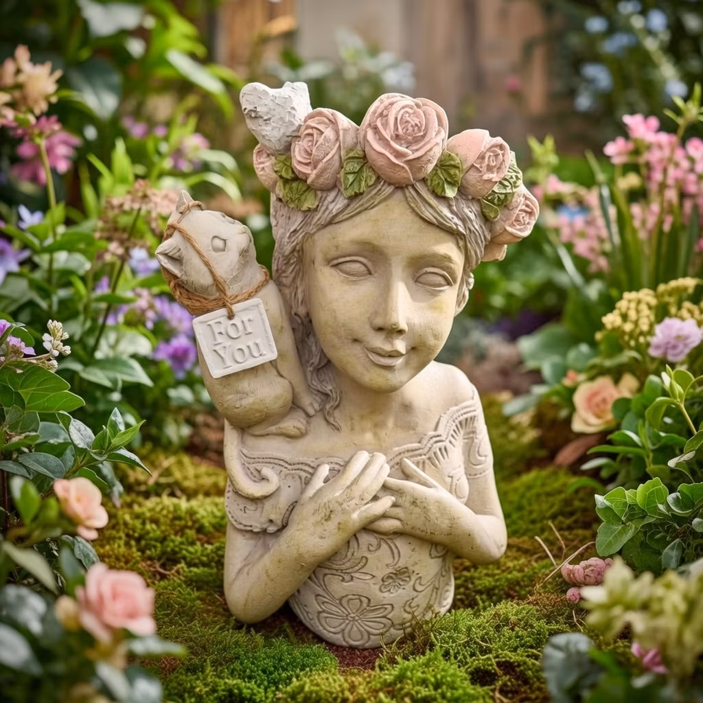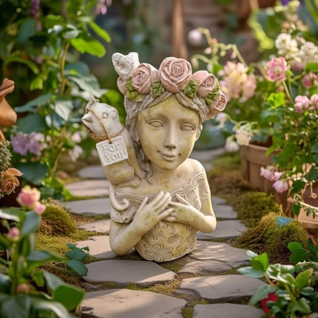 Stor kruka i betong – kvinna med rosor och kattEn handgjuten, vacker kruka formad som en kvinna med rosor och en katt på axlarna. Perfekt som dekorativ detalj i