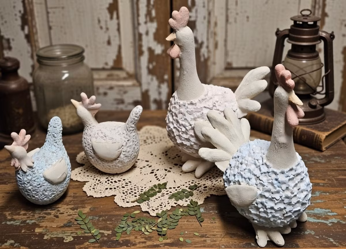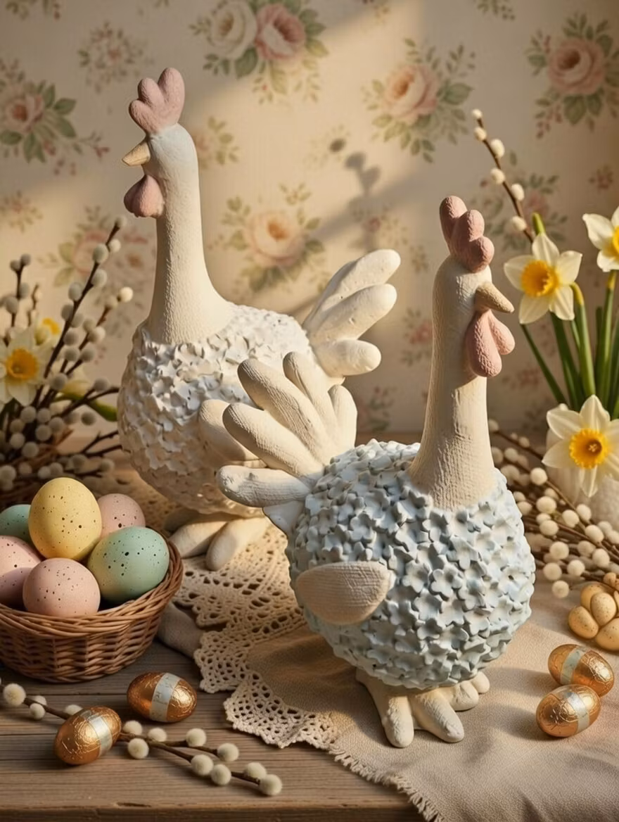 Handgjutna tupp och höna med långa halsar och lätt blommiga kroppar, perfekta som charmiga dekorationsdetaljer både till påsk och året runt.