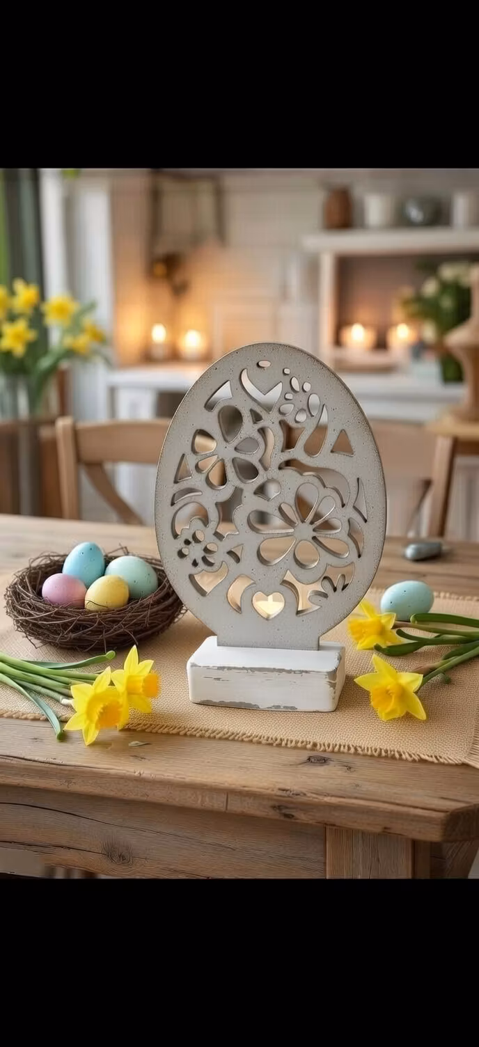 Prydnadsägg på fot – ljuslykta för påskEtt handgjutet ägg i betong på piedestal, perfekt för värmeljus.Skapar en stämningsfull och dekorativ detalj på bordet, h